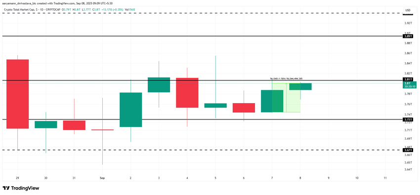 O valor total do mercado de criptomoedas subiu US$ 56 bilhões nas últimas 24 horas, agora avaliado em US$ 3,80 trilhões. O TOTAL permanece abaixo da resistência de US$ 3,81 trilhões, um nível-chave que os traders estão observando atentamente para determinar se o momentum pode ser sustentado no curto prazo.