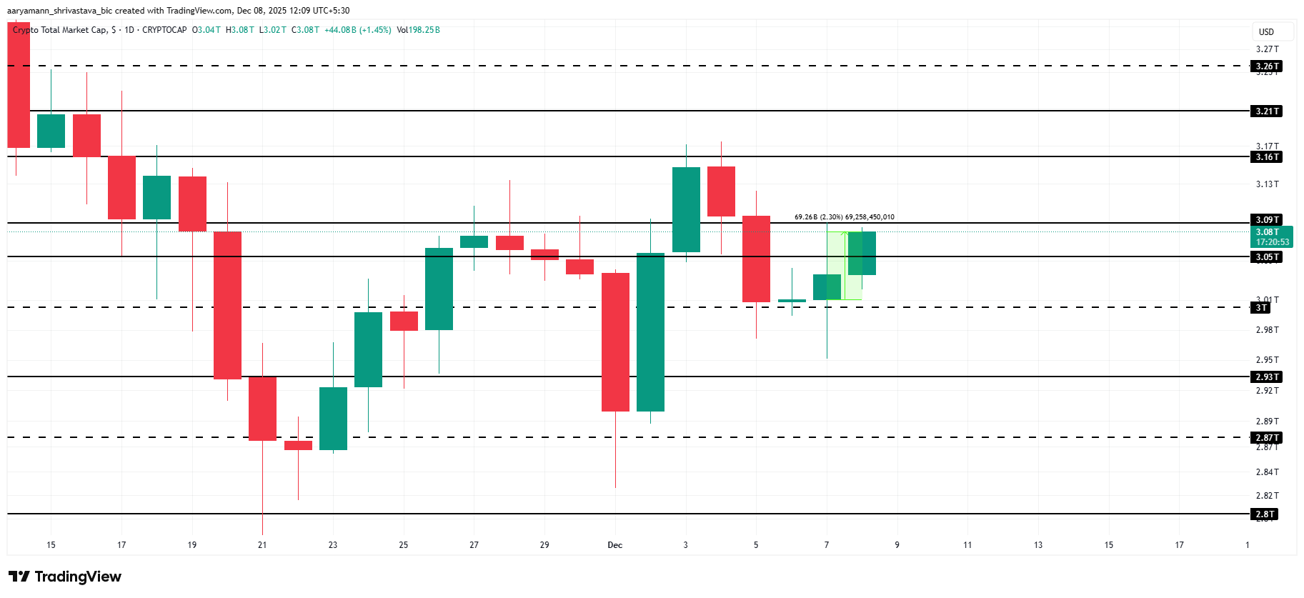 A capitalização total do mercado de criptomoedas aumentou em US$ 69 bilhões nas últimas 24 horas, atingindo US$ 3,08 trilhões. O token TOTAL se recuperou após atingir o nível de suporte de US$ 3 trilhões, que continua a ancorar a estabilidade do mercado em geral.