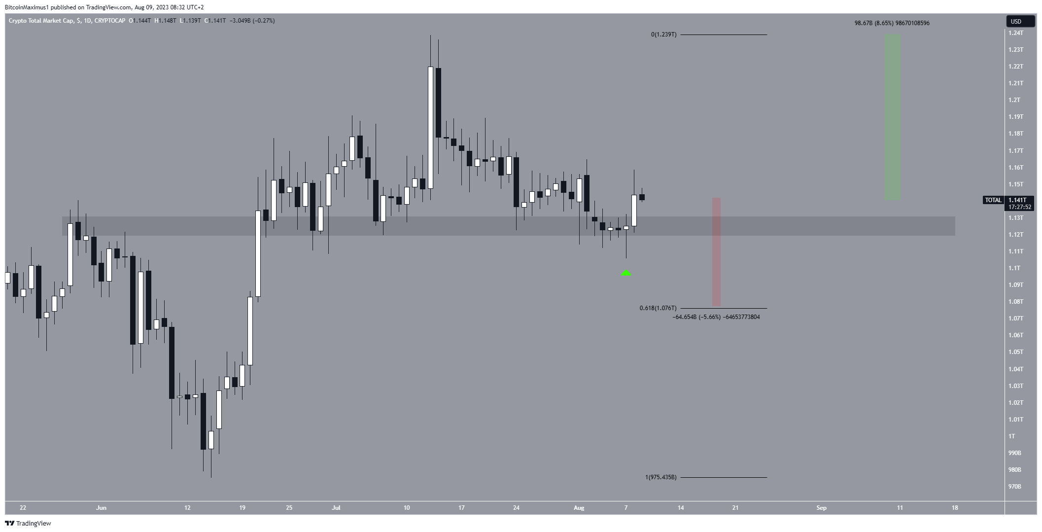 O TOTALCAP sofreu uma queda após atingir o topo de US$ 1,24 trilhão em 13 de julho. A queda persistiu até 7 de agosto, quando o preço atingiu a mínima de US$ 1,10 trilhão.