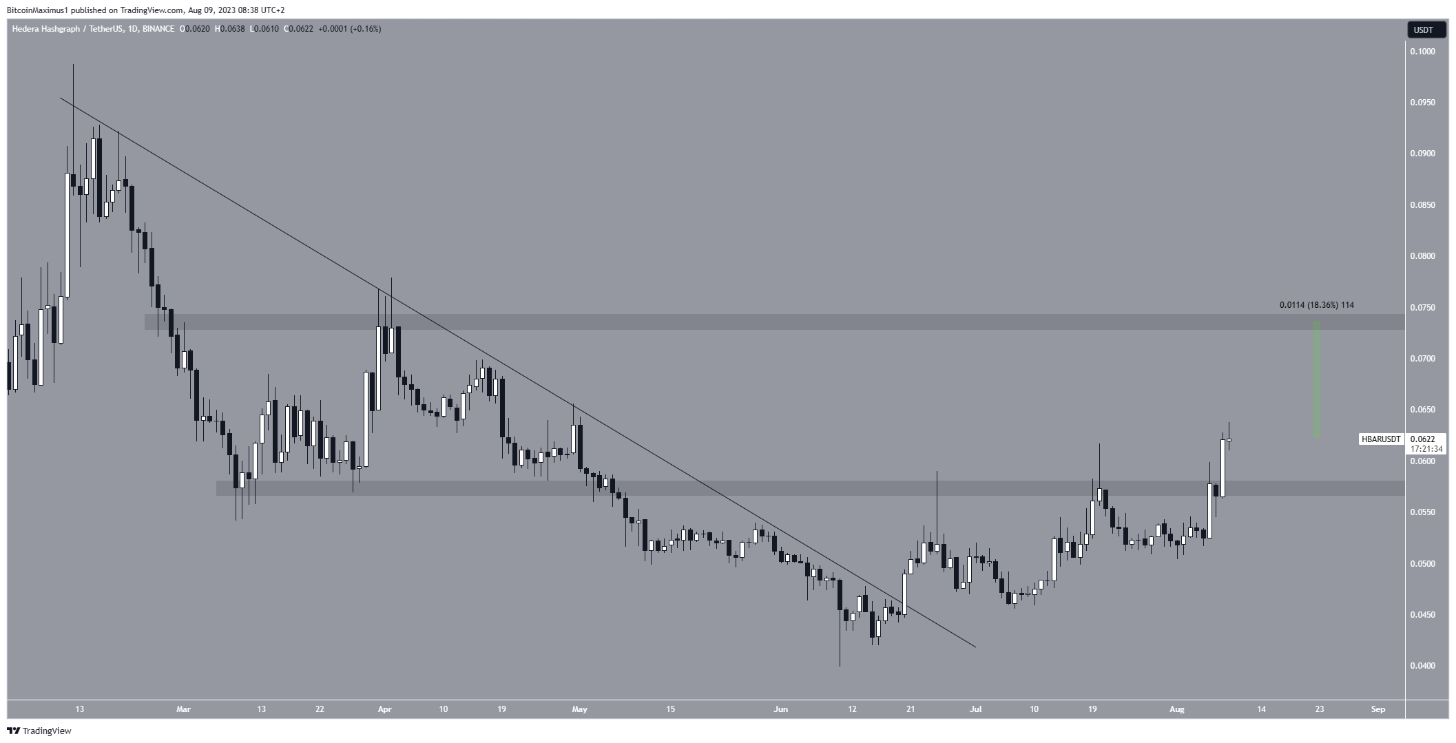 A HBAR está em tendência de baixa desde que saiu de uma área de resistência diagonal em 20 de junho. O preço criou vários fundos e topos mais altos desde então. Ambos são considerados sinais de que os touros assumiram o controle.