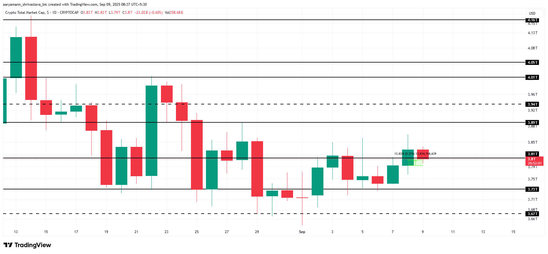 No entanto, se o sentimento dos investidores enfraquecer e os tokens em todo o mercado não conseguirem obter suporte suficiente, a TOTAL pode reverter seus ganhos. Uma queda abaixo de US$ 3,81 trilhões pode arrastar o mercado de volta para US$ 3,73 trilhões, invalidando efetivamente a atual tese otimista.