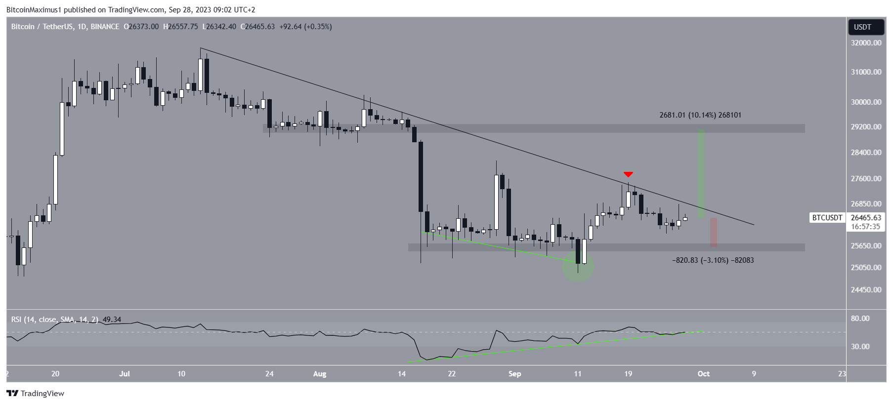 Apesar da divergência, o BTC não conseguiu sair da linha de tendência de resistência descendente. Em vez disso, foi rejeitado por ele em 19 de setembro (ícone vermelho).