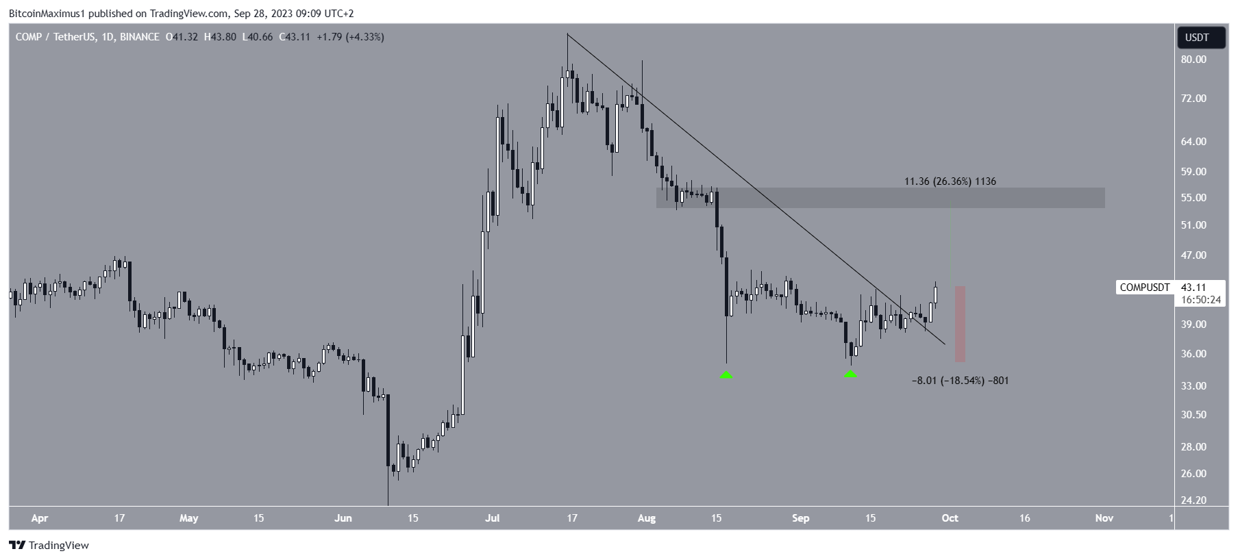 O Compound subiu desde o segundo fundo. Em 24 de setembro, rompeu sua linha de tendência de resistência descendente, indicando que a tendência é de alta.