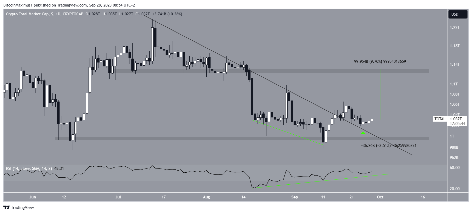 Sponsored SponsoredO TOTALCAP poderá aumentar potencialmente em 10% e atingir o nível de resistência de US$ 1,12 trilhão caso mantenha o seu padrão anterior.