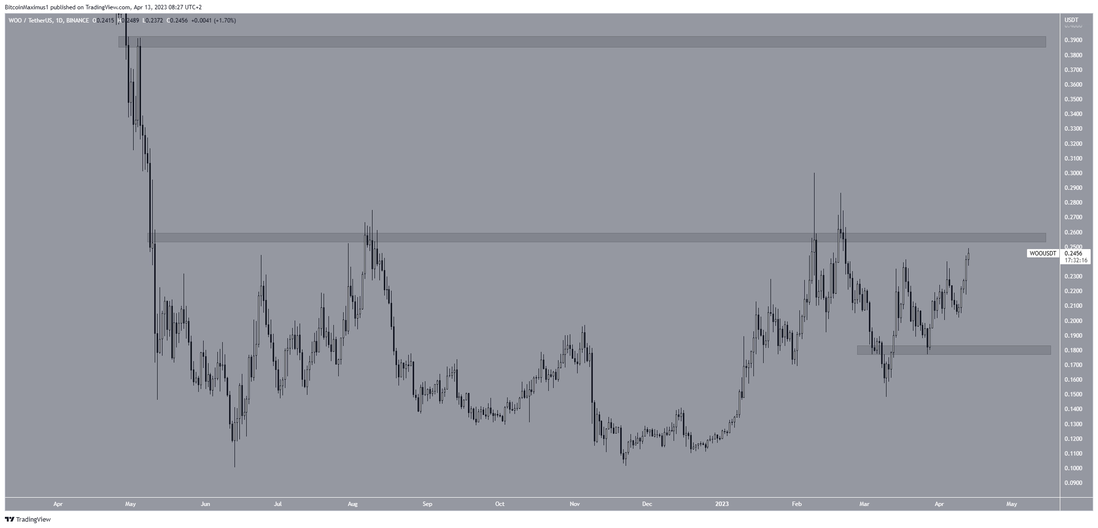 O preço do WOO tem subido rapidamente desde 10 de março. Agora, está se aproximando da área de resistência de US$ 0,26, que está em vigor desde maio de 2022.