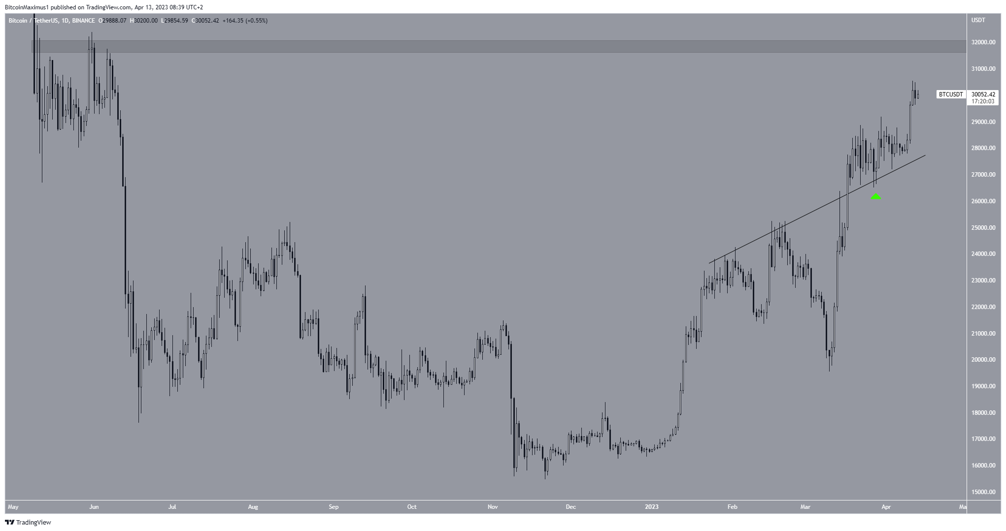 Depois de romper uma linha de tendência de alta e confirmá-la como suporte em 27 de março (indicado pelo ícone verde), o preço do Bitcoin voltou a subir. O movimento ganhou força em 9 de abril, resultando em uma nova máxima anual de US$ 30.550.
