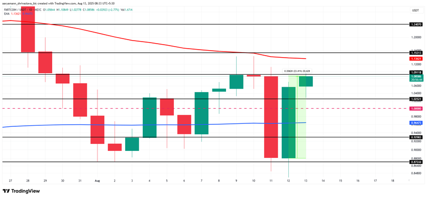 Atualmente negociado a US$ 1,08, a FARTCOIN está logo abaixo da resistência de US$ 1,09. Se a moeda superar esse nível e se tornar um suporte, poderá abrir caminho para um aumento ainda maior no preço. Um rompimento bem-sucedido acima de US$ 1,09 pode impulsionar a FARTCOIN em direção à próxima meta de US$ 1,15, continuando sua tendência de alta.