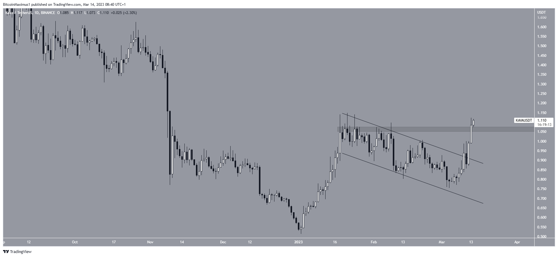 O preço da KAVA saiu de um canal paralelo de baixa no último sábado (11). Isso marcou o fim de uma correção que estava em andamento desde o final de janeiro.