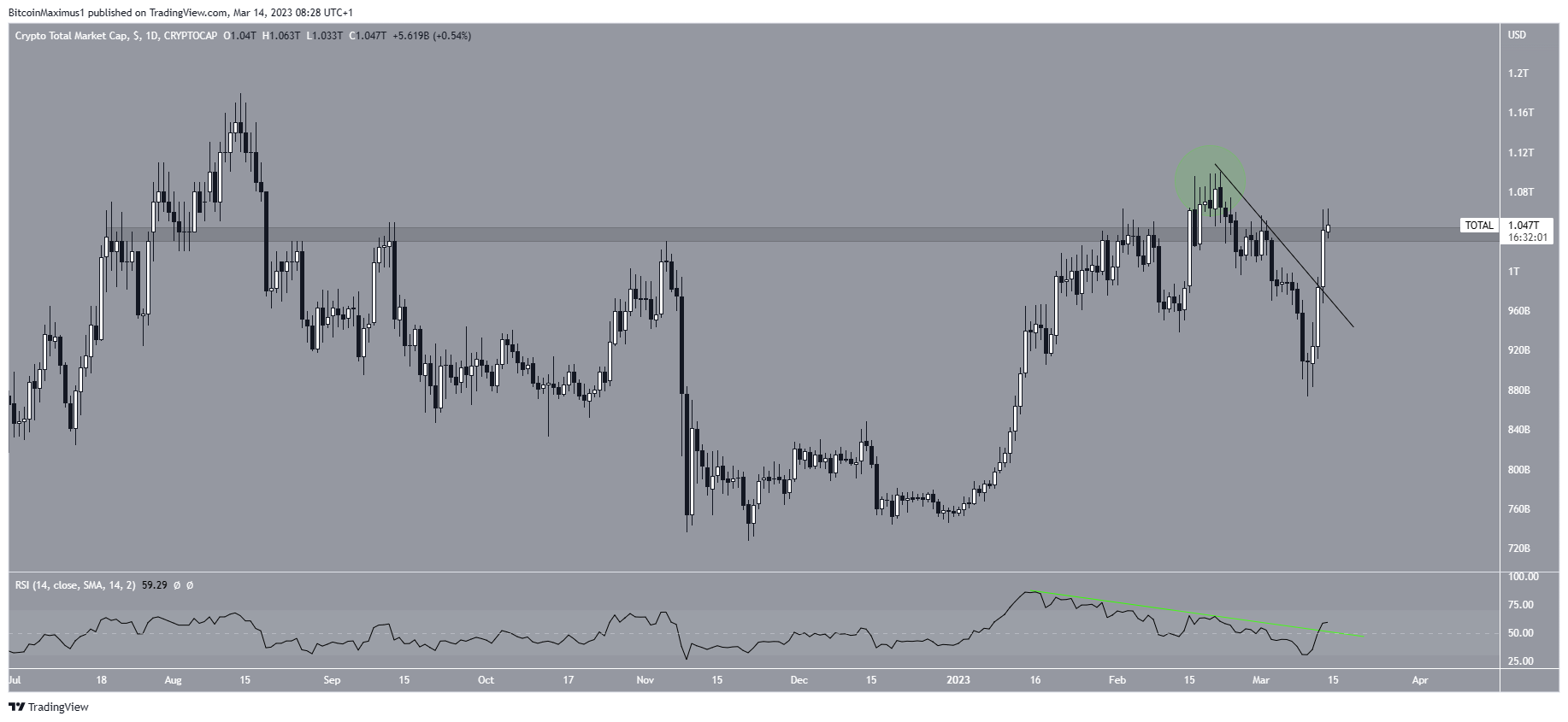 O TOTALCAP caiu abaixo de uma linha de tendência de baixa desde que se desviou acima da área de resistência de US$ 1,03 trilhão no final de fevereiro (círculo verde). A queda levou a uma mínima de US$ 873,24 bilhões na segunda-feira (13).
