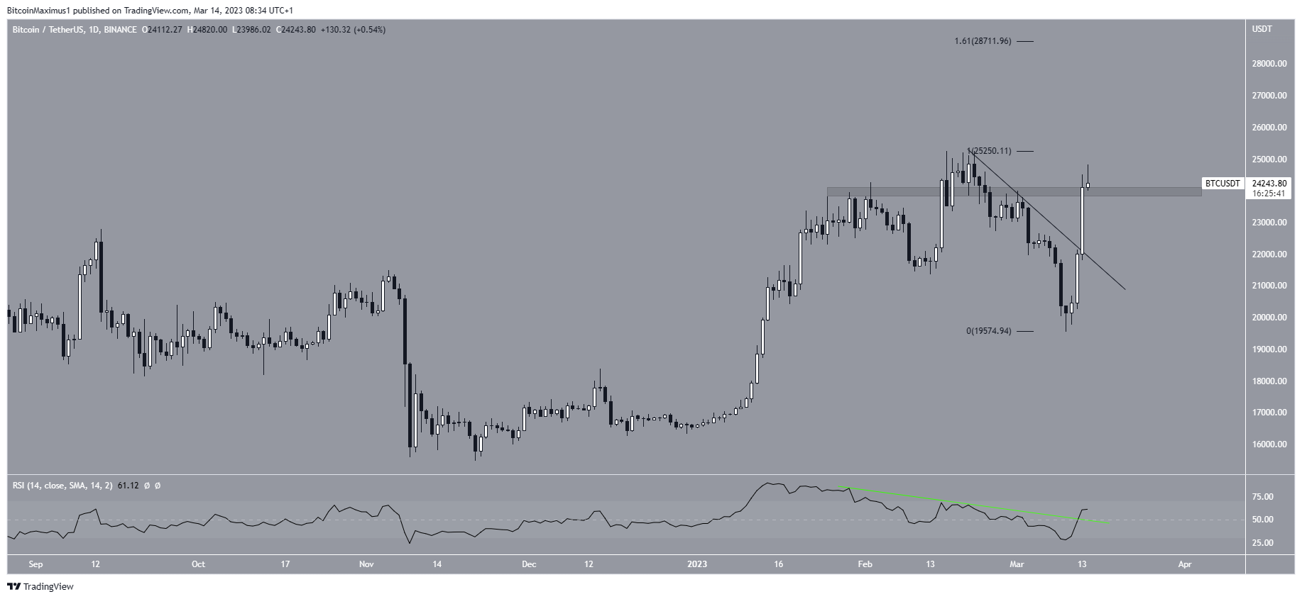 A movimentação de preço do Bitcoin é muito semelhante ao do TOTALCAP. O ativo saiu de uma linha de tendência de baixa enquanto o RSI saiu de sua linha de divergência de baixa.