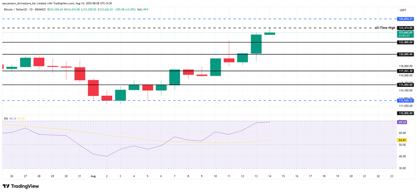 O preço do Bitcoin continuou sua trajetória ascendente, atingindo uma nova máxima histórica (ATH) de US$ 124.474 nas últimas 24 horas. Isso marca a segunda máxima histórica (ATH) em um mês, demonstrando forte interesse dos investidores e sentimento otimista.