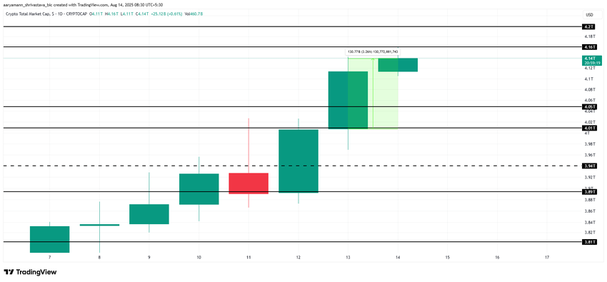 O mercado de criptomoedas registrou um aumento significativo de US$ 130 bilhões nas últimas 24 horas, elevando o valor total de mercado para US$ 4,14 trilhões. Esse aumento é impulsionado pelo crescimento em diversos setores, refletindo o sentimento positivo dos investidores e uma recuperação mais ampla do mercado financeiro.