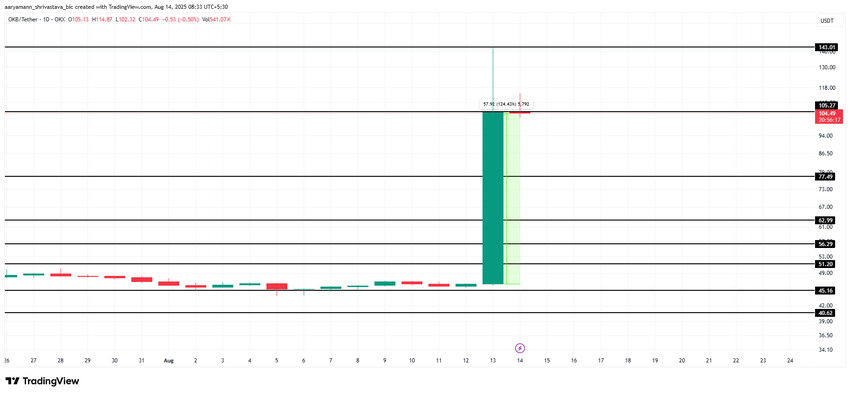 A redução na oferta circulante elevou o preço da OKB para US$ 104, com a altcoin agora buscando garantir US$ 105 como suporte. Se a OKB conseguir manter esse nível, poderá continuar sua trajetória ascendente rumo a uma máxima intradiária de US$ 143, elevando ainda mais o preço no curto prazo.