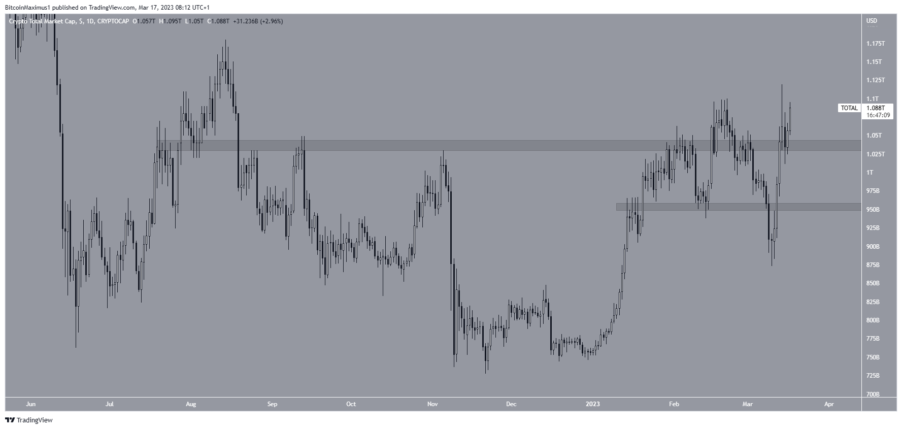 O TOTALCAP iniciou um movimento de alta em 10 de março e atingiu uma nova máxima anual de US$ 1,12 trilhão quatro dias depois. O preço caiu em seguida, mas saltou na área horizontal de US$ 1,04 trilhão, iniciando outro movimento de alta.