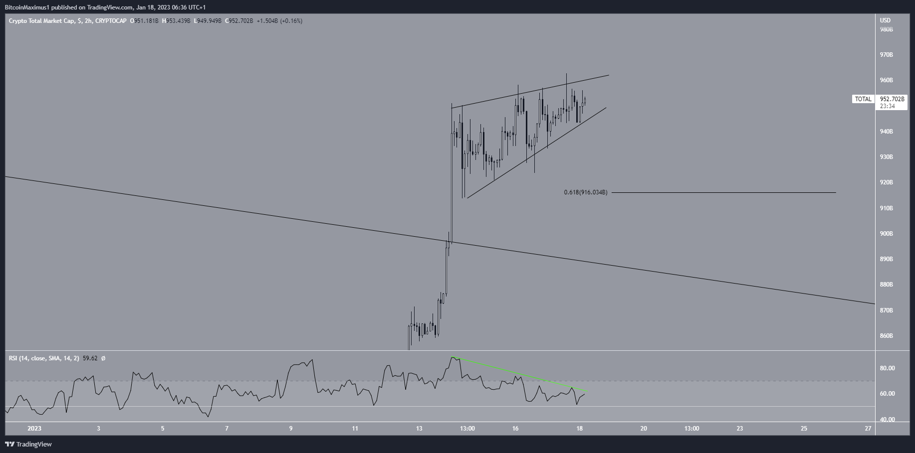 Atualmente, o TOTALCAP está negociado dentro de uma cunha de alta, que é considerada um padrão de baixa. Além disso, o padrão é combinado com uma divergência de baixa no RSI (linha verde).