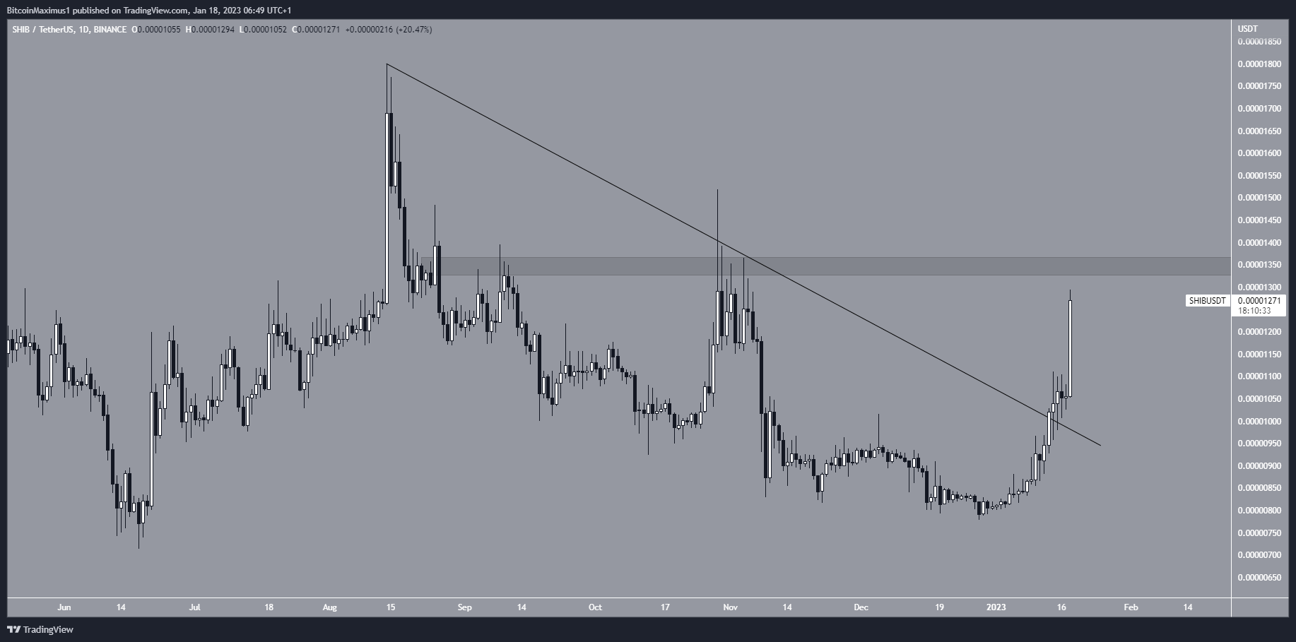 A SHIB está em tendência de alta desde 29 de dezembro. O preço rompeu uma linha de tendência de baixa na última sexta-feira e atingiu uma alta de US$ 0,0000128 cinco dias depois.