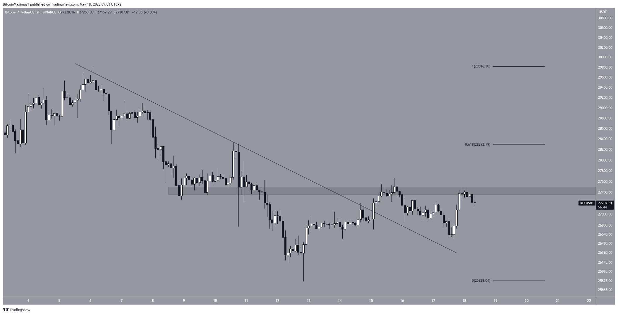 O preço do Bitcoin saiu de uma linha de tendência de baixa em 15 de maio. No entanto, não conseguiu iniciar uma alta significativa e foi rejeitado pela área de resistência de US$ 27.400. Atualmente, o preço está fazendo outra tentativa de rompimento.