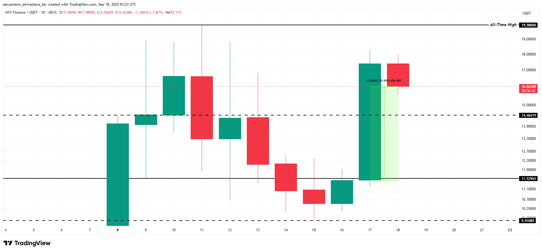 O preço da MYX subiu quase 40% nas últimas 24 horas, tornando-se a altcoin com melhor desempenho do dia. Essa alta levou o token para mais perto de sua máxima histórica de US$ 19,98, alimentando o otimismo entre os traders que agora veem o MYX como um dos ativos mais fortes do mercado.
