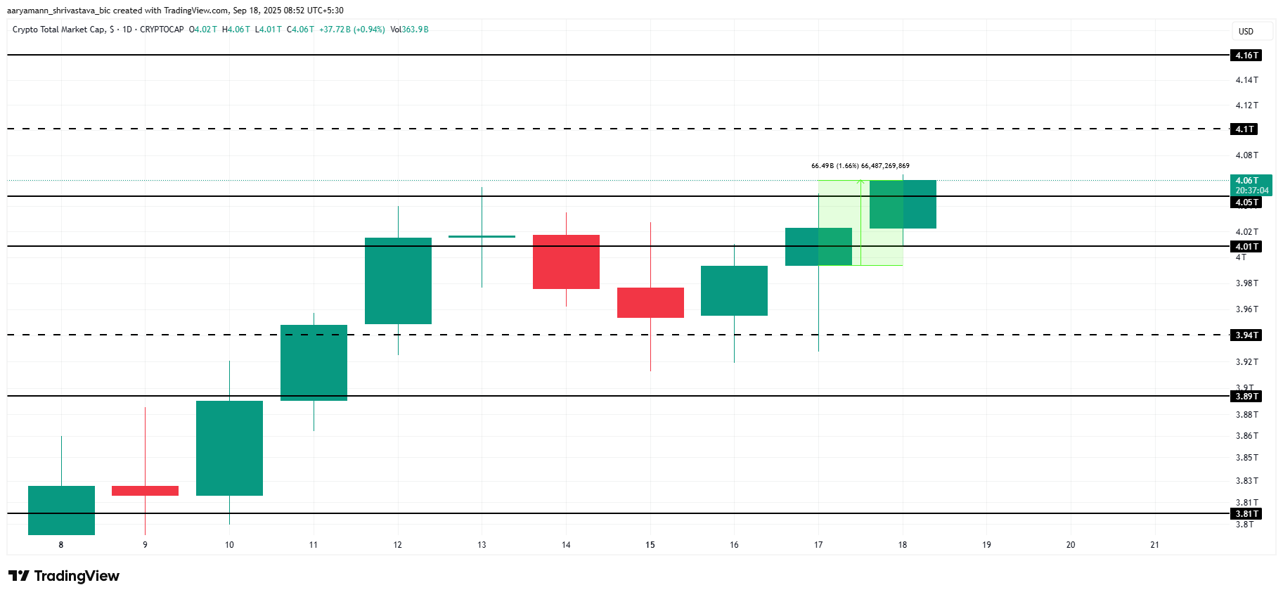 O recente anúncio do FOMC de um corte de 25 pontos-base na taxa de juros impactou positivamente os ativos digitais. A TOTAL agora mira US$ 4,10 trilhões como sua próxima resistência. Transformar essa barreira em suporte fortaleceria o sentimento otimista.