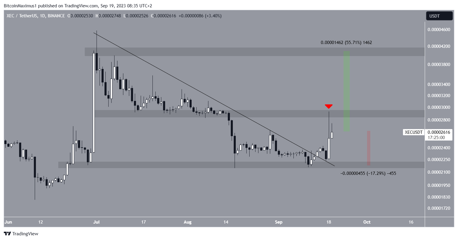 O XEC está em tendência de baixa desde 17 de agosto. O preço criou uma mínima mais alta em 11 de setembro e rompeu uma linha de tendência de baixa três dias depois. Em 18 de setembro, o preço atingiu a máxima de US$ 0,000029.