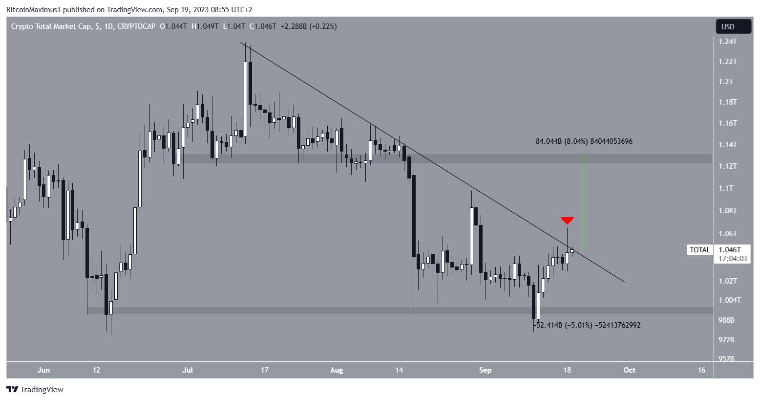 O TOTALCAP caiu abaixo de uma linha de tendência de baixa desde 13 de julho. O movimento levou a uma mínima de US$ 978 bilhões em 11 de setembro.