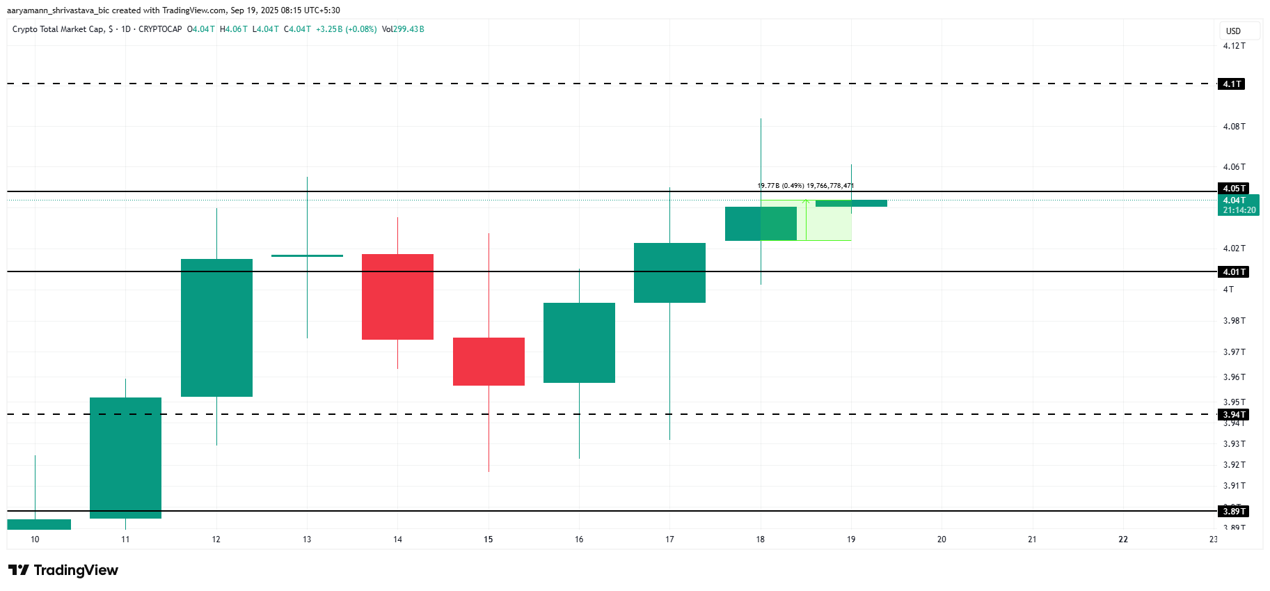 O valor total do mercado de criptomoedas aumentou quase US$ 20 bilhões nas últimas 24 horas, chegando a US$ 4,04 trilhões. O TOTAL agora enfrenta resistência em US$ 4,05 trilhões, um nível que determinará se o mercado de ativos digitais em geral continuará sua alta.