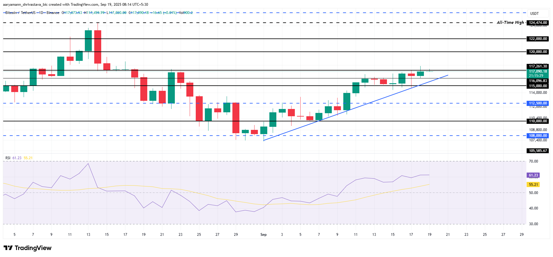 O preço do Bitcoin tem permanecido em tendência de alta constante desde o início do mês, sendo negociado atualmente a US$ 117.090. O gigante das criptomoedas enfrenta forte resistência em US$ 117.261, o que decidirá se o BTC conseguirá estender sua alta ou enfrentar uma rejeição a curto prazo.