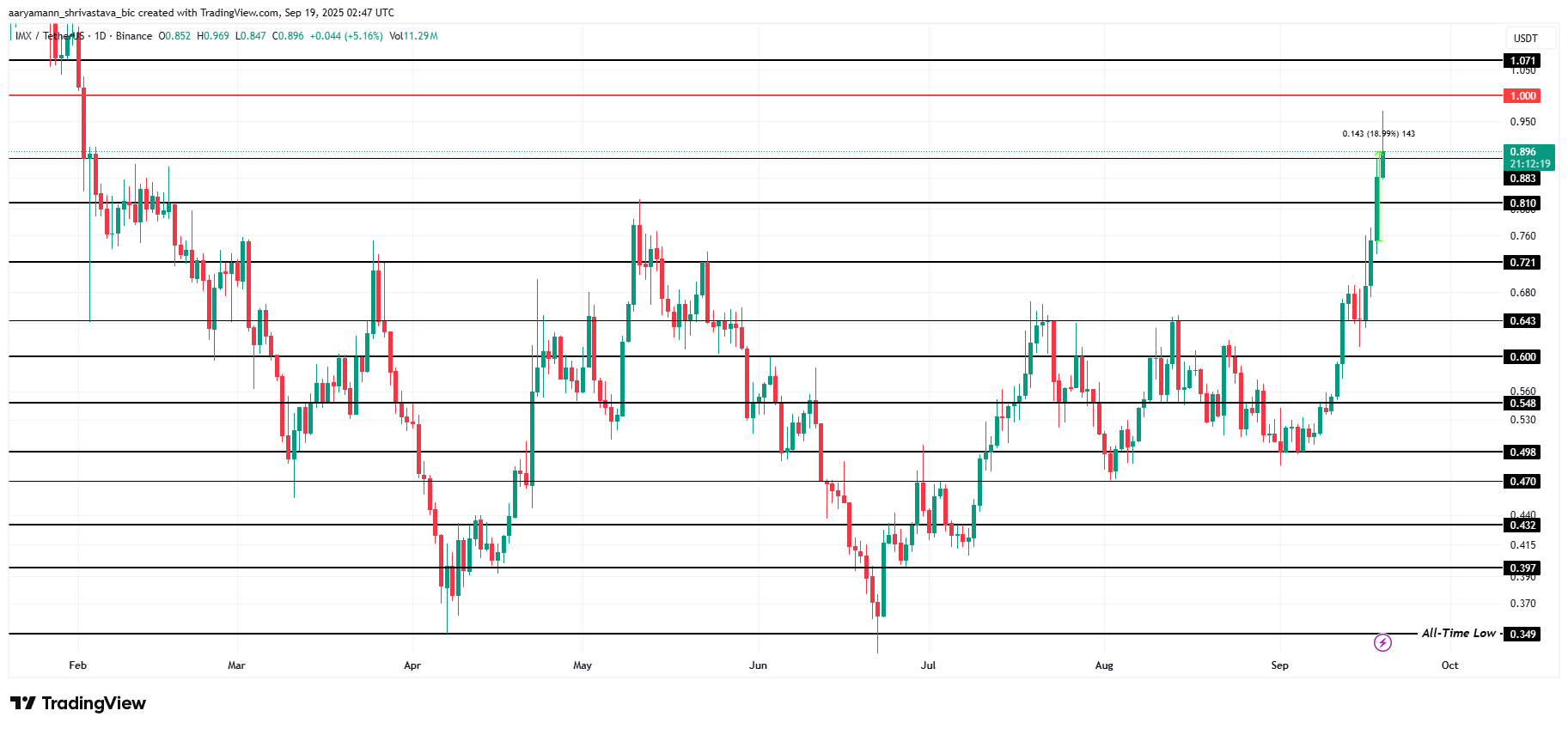 O preço da IMX subiu quase 19% nas últimas 24 horas, sendo negociado atualmente a US$ 0,896. Essa alta elevou a altcoin à máxima em 7 meses. Isso reflete o forte interesse dos investidores e o sentimento otimista em todo o mercado de criptomoedas, apesar da volatilidade recente .