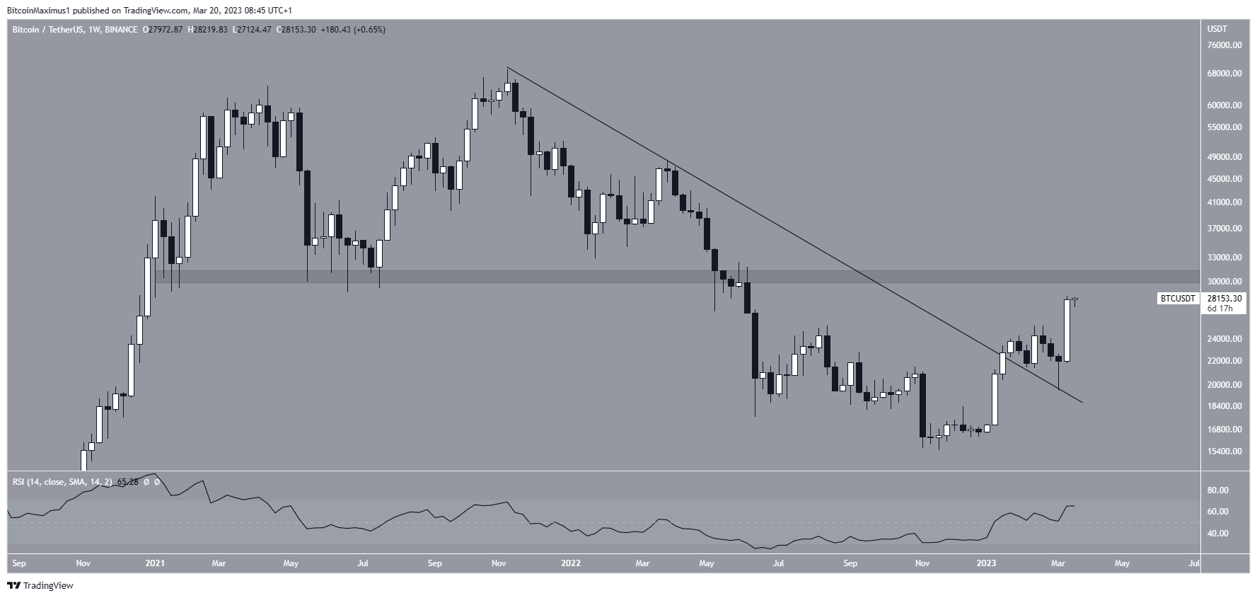 Se o preço do BTC subir, ele poderá atingir a próxima área de resistência em US$ 30.500. Essa possibilidade é suportada pelo movimento do RSI e pelo rompimento em andamento. No entanto, se o rali perder força, o preço poderá cair para a área de suporte de US$ 23.000 novamente.