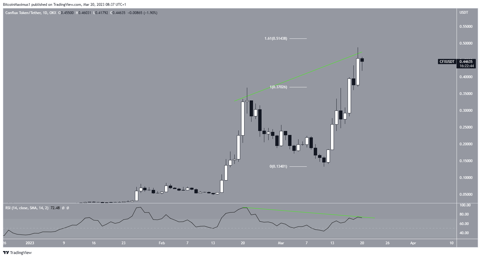 O CFX está em alta desde o início do ano. Após uma queda a partir de 21 de fevereiro, o preço recuperou o equilíbrio e atingiu uma nova máxima anual de US$ 0,488 em 19 de março.