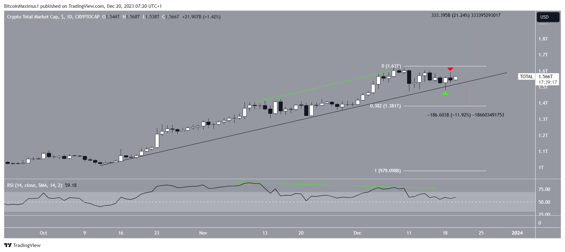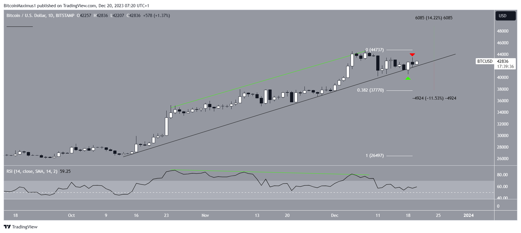 Da mesma forma que o TOTALCAP, o Bitcoin subiu ao longo de uma linha de tendência de alta desde outubro. O movimento culminou com uma nova máxima anual de US$ 44.729 em 8 de dezembro.