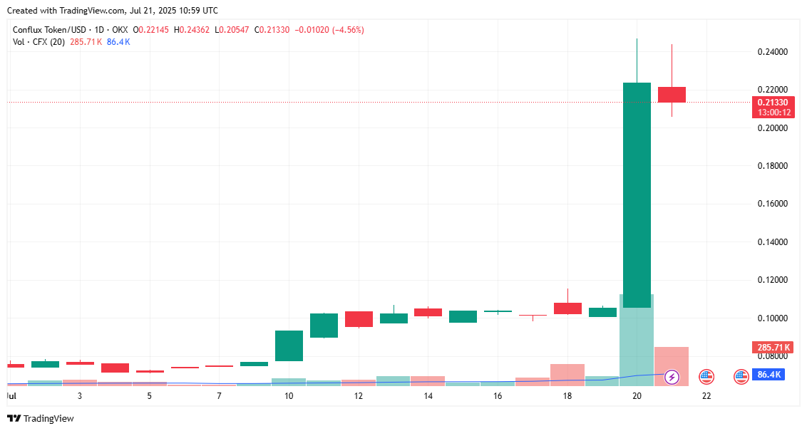 A Conflux registrou o melhor desempenho entre as altcoins nas últimas 24 horas, com valorização de 110%, alcançando US$ 0,22. A alta foi impulsionada pela conferência da rede em Xangai, que apresentou avanços no ecossistema e elevou o otimismo do mercado.