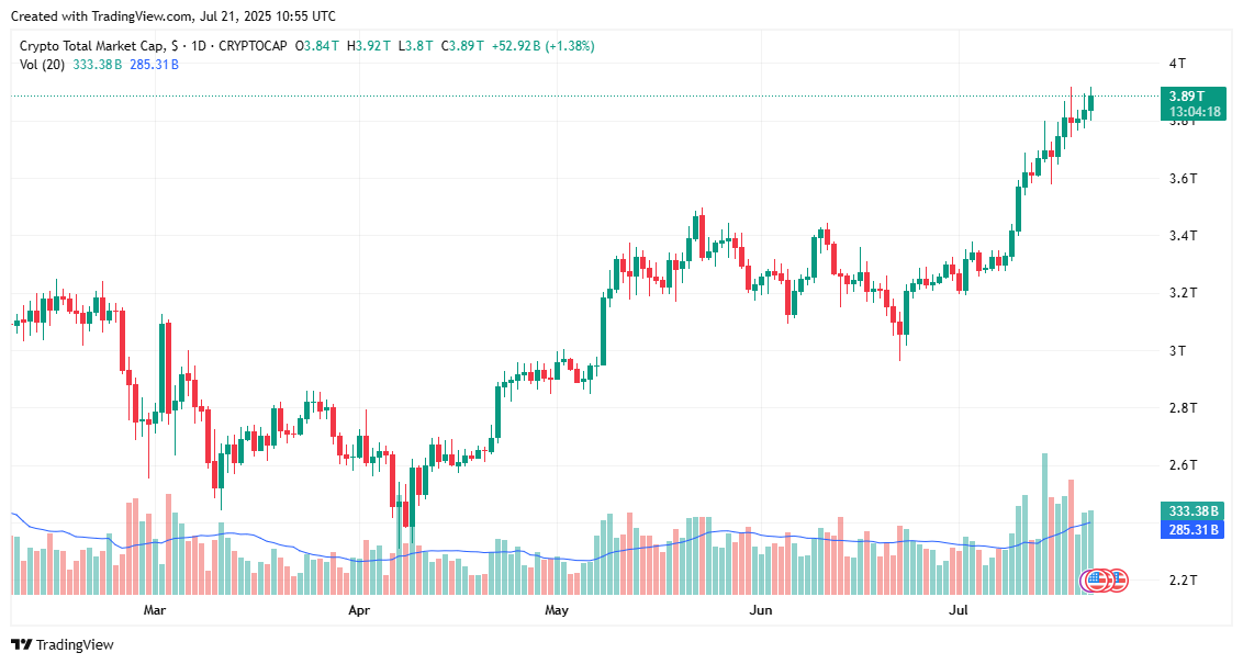 O crescimento recente é atribuído à força das altcoins, enquanto o BTC permanece estável. Com esse cenário, o mercado se aproxima da barreira de US$ 4 trilhões. Caso a tendência de valorização continue ou o BTC supere US$ 120 mil, o total de capitalização pode transformar a região de US$ 3,90 trilhões em suporte, reforçando o movimento de alta.