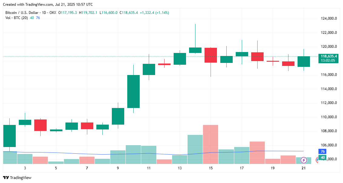 O Bitcoin é negociado a US$ 118.620, dentro de uma faixa entre US$ 117 mil e US$ 120 mil. O comportamento lateral ocorre enquanto o capital migra para altcoins, sugerindo o início de uma possível temporada voltada a essas moedas.