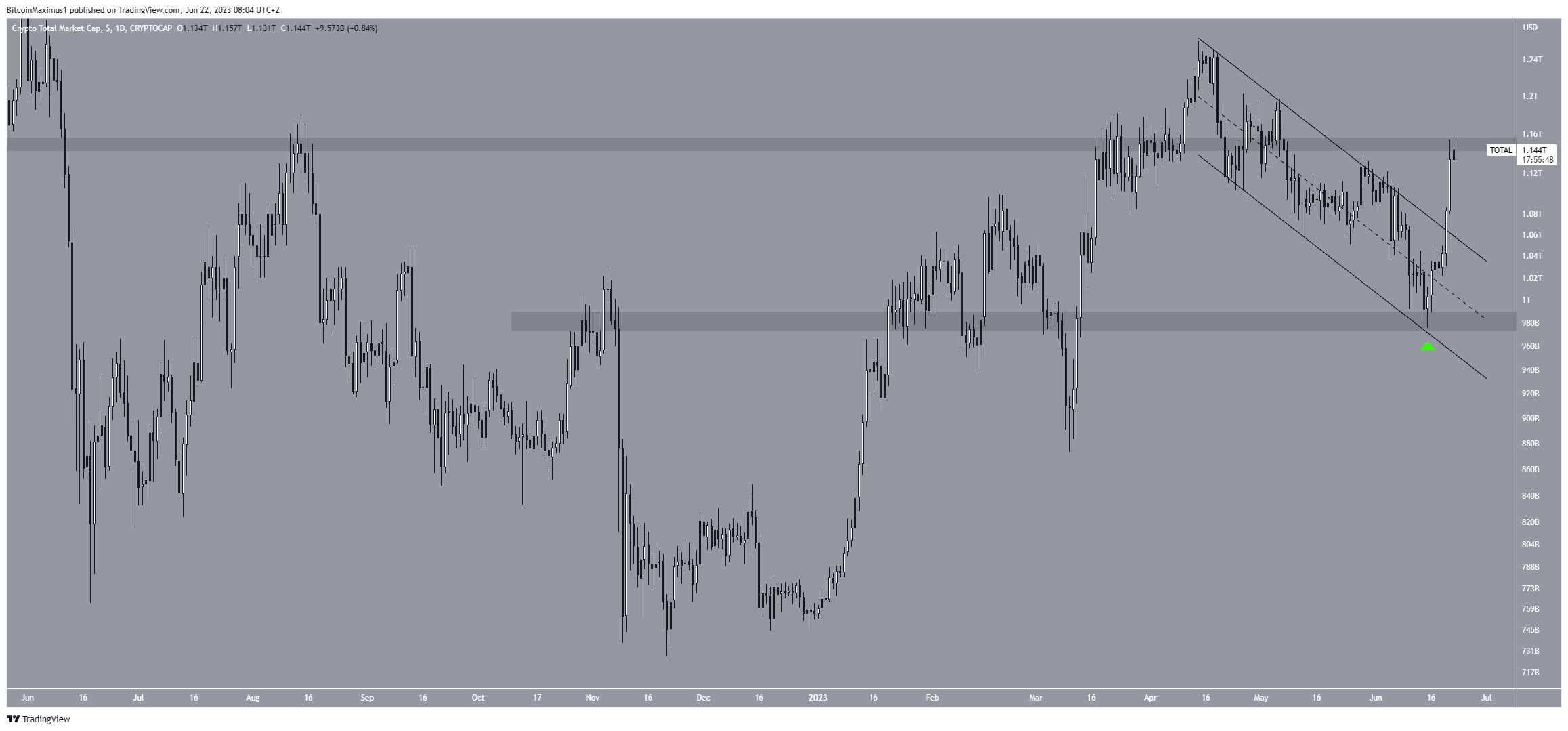 O valor total do mercado de criptomoedas (TOTALCAP) e o preço do Bitcoin (BTC) ultrapassaram seus padrões corretivos e quase atingiram novas máximas anuais. Enquanto isso a Pepe (PEPE) iniciou sua recuperação saindo de uma linha de tendência de baixa.