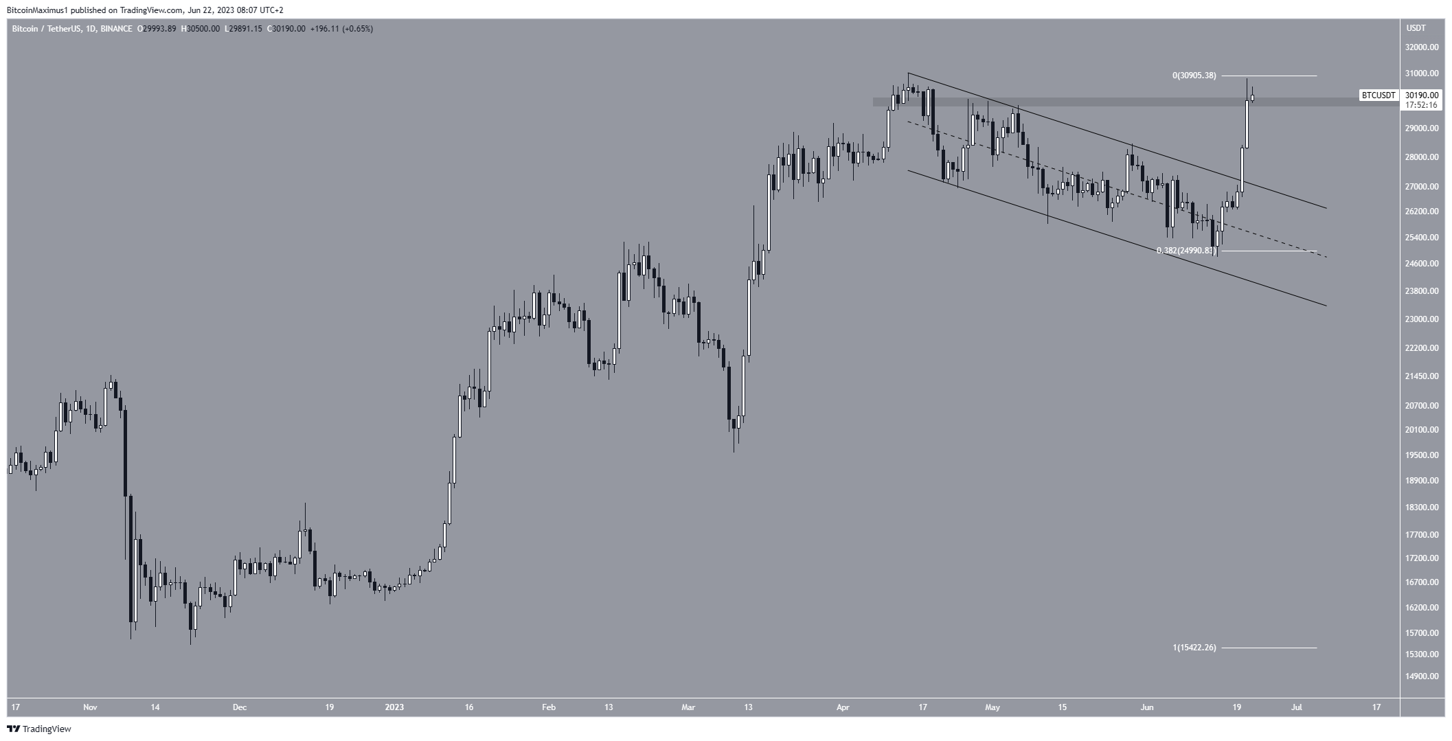 Da mesma forma que o TOTALCAP, o Bitcoin saiu de um canal paralelo de baixa em 20 de junho. O movimento foi rápido, fazendo com que o preço atingisse a área de resistência de US$ 30.000 e se movesse um pouco acima dela.