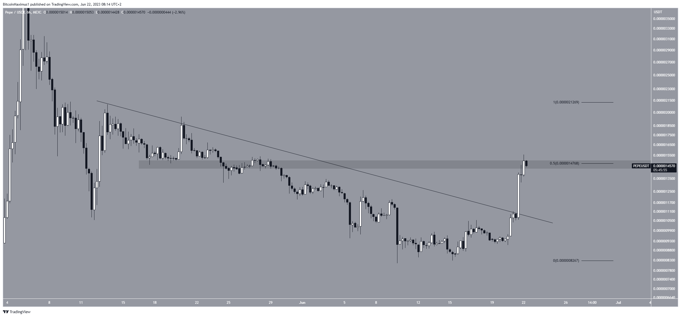 O preço do PEPE rompeu uma linha de tendência de baixa em 21 de junho. Antes do rompimento, a linha estava em vigor desde 14 de maio.