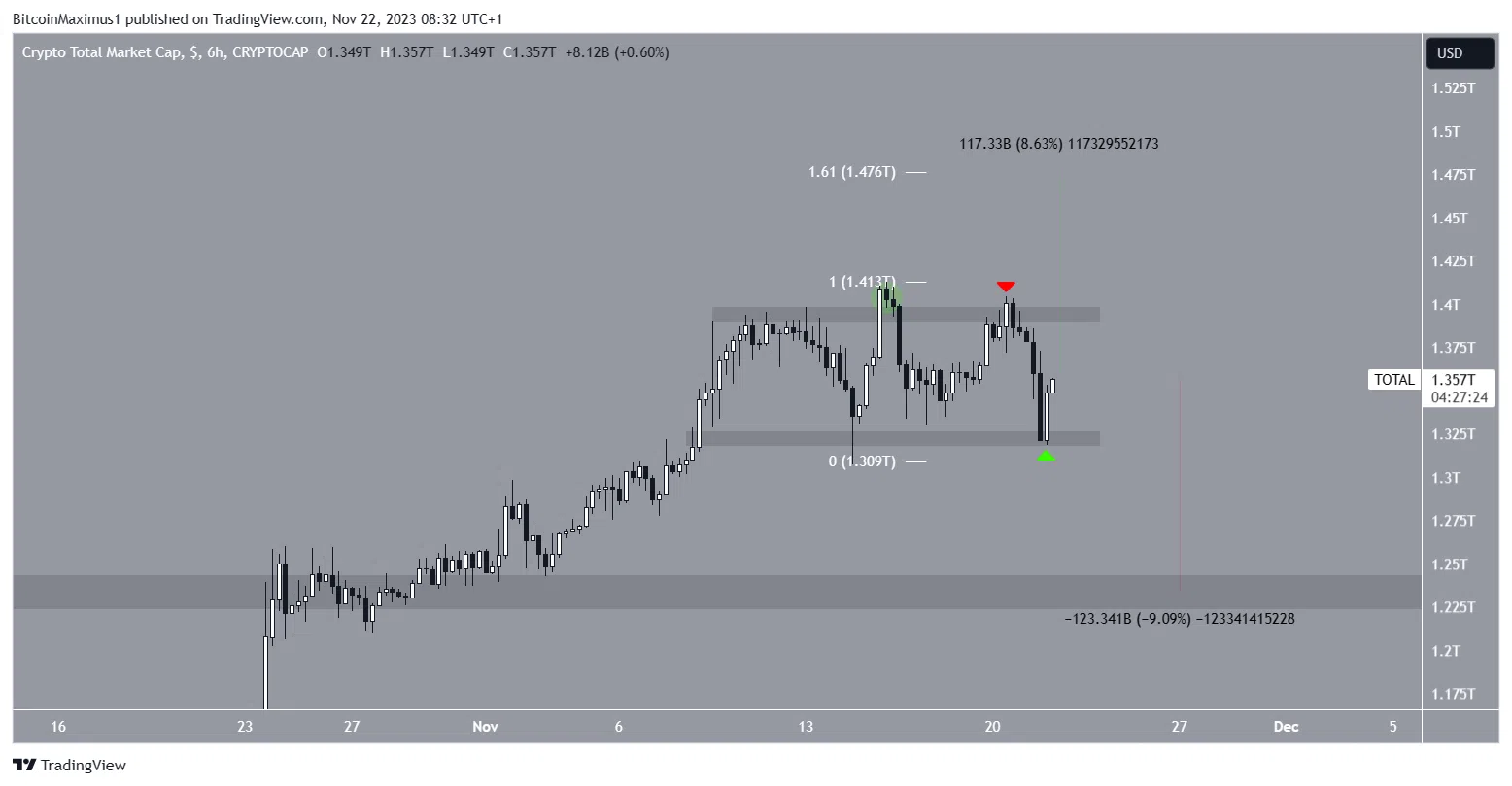 Se o TOTALCAP continuar subindo e sair da faixa máxima, ele pode aumentar em 9% e atingir a área de resistência de US$ 1,48 trilhão, criada pela retração externa de 1,61 de Fibonacci da queda anterior.