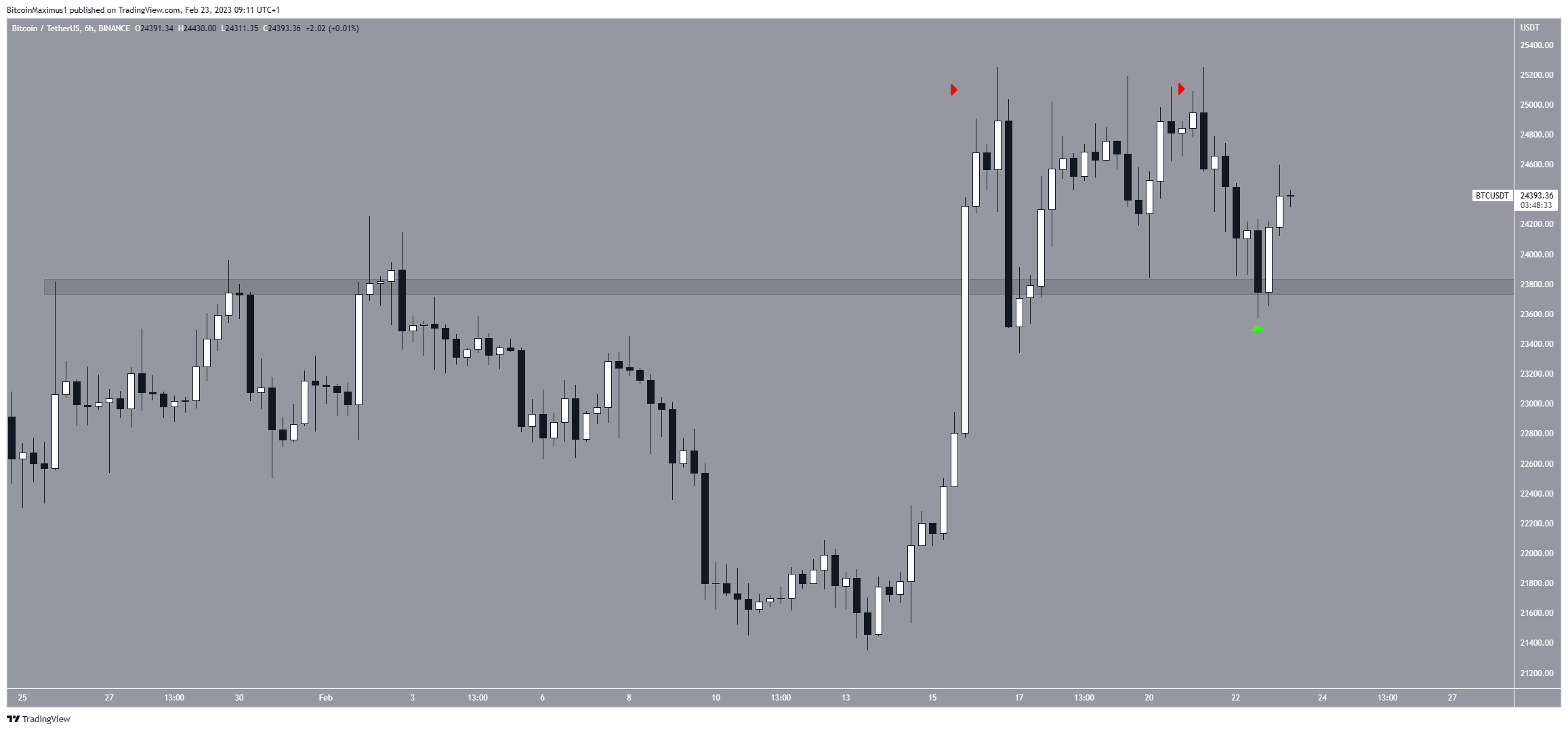 O preço do Bitcoin criou um padrão de topo duplo em 15 e 22 de fevereiro (ícone verde). Isso levou a um movimento de baixa e validou a área horizontal de US$ 23.800 como suporte.