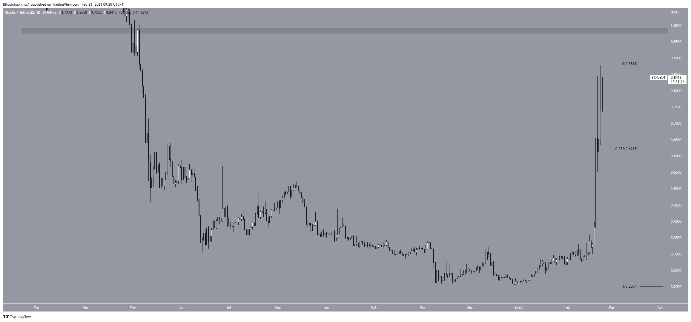 O preço do Stacks está dentro de um grande movimento de alta desde 16 de fevereiro. Esse movimento levou a uma nova máxima anual de US$ 0,88. O movimento também é completamente parabólico. Se continuar, a próxima resistência será em US$ 0,95.