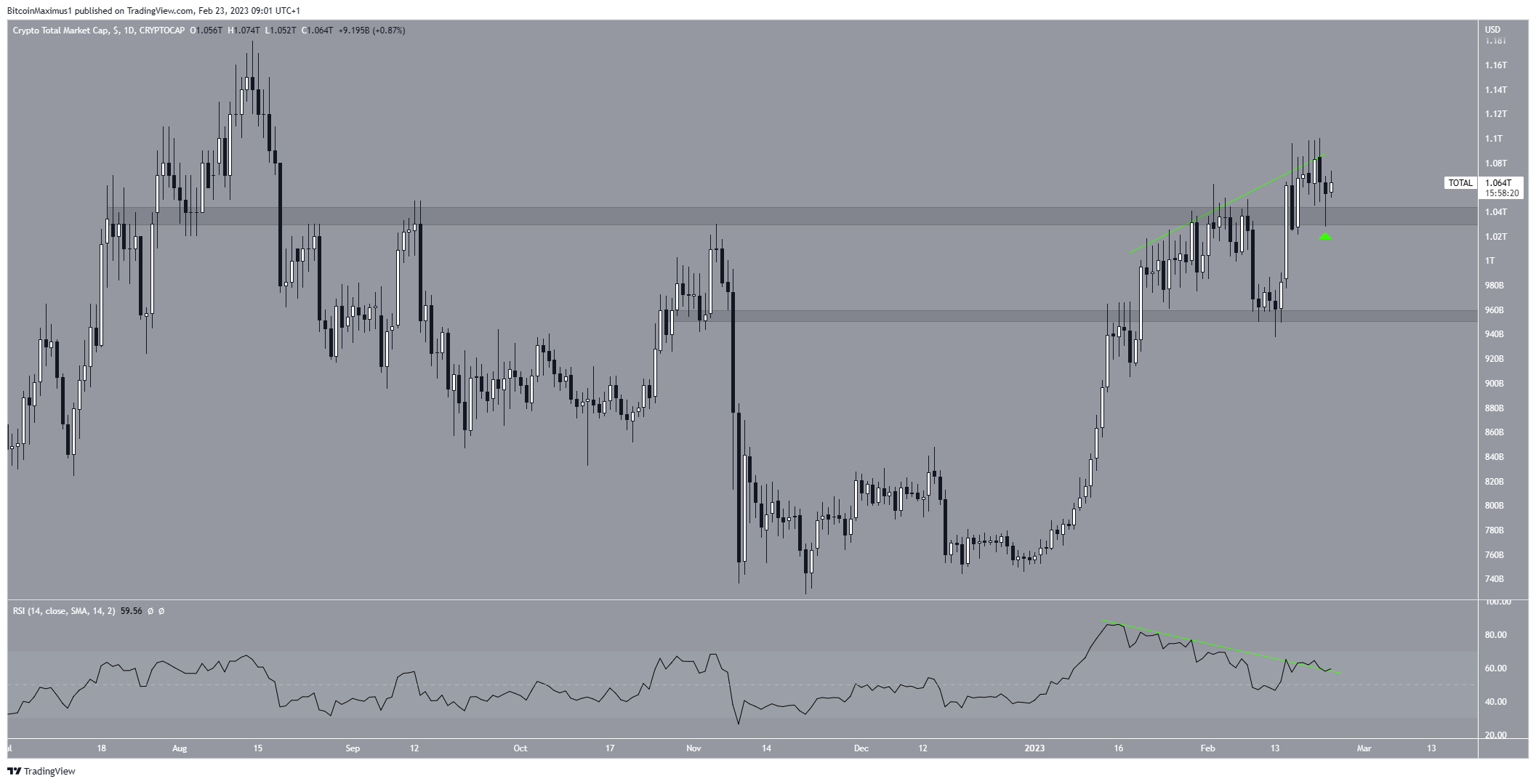 O TOTALCAP saiu da área de resistência de US$ 1,04 trilhão em 15 de fevereiro. Ele a validou como suporte nos próximos dois dias, saltando para uma alta de US$ 1,1 trilhão na última terça-feira (21).