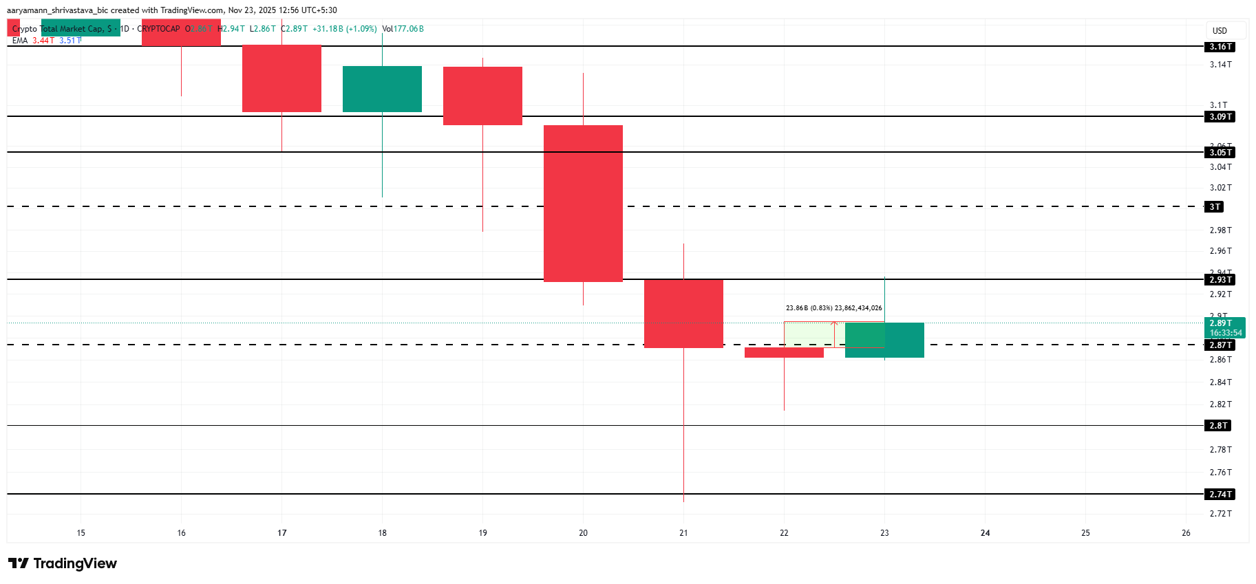 Caso a pressão baixista prevaleça apesar do lançamento do ETF, o mercado poderá reverter sua tendência. Uma queda poderia levar o valor total do ETF de volta a US$ 2,80 trilhões ou menos, com a retomada de vendas generalizadas. A baixa liquidez e o sentimento de aversão ao risco reforçariam a queda em todo o mercado de criptomoedas.