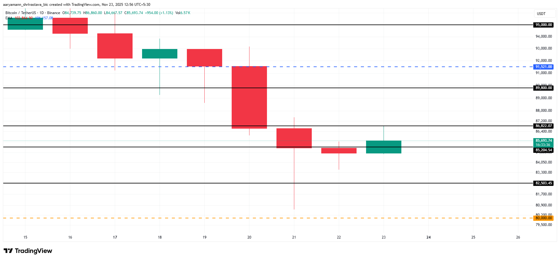 Caso as condições de mercado se deteriorem, o Bitcoin poderá não conseguir romper a resistência e, em vez disso, cair ainda mais. Uma queda em direção ao nível de suporte de US$ 82.503 invalidaria a tese de alta e sinalizaria uma renovada pressão de baixa.