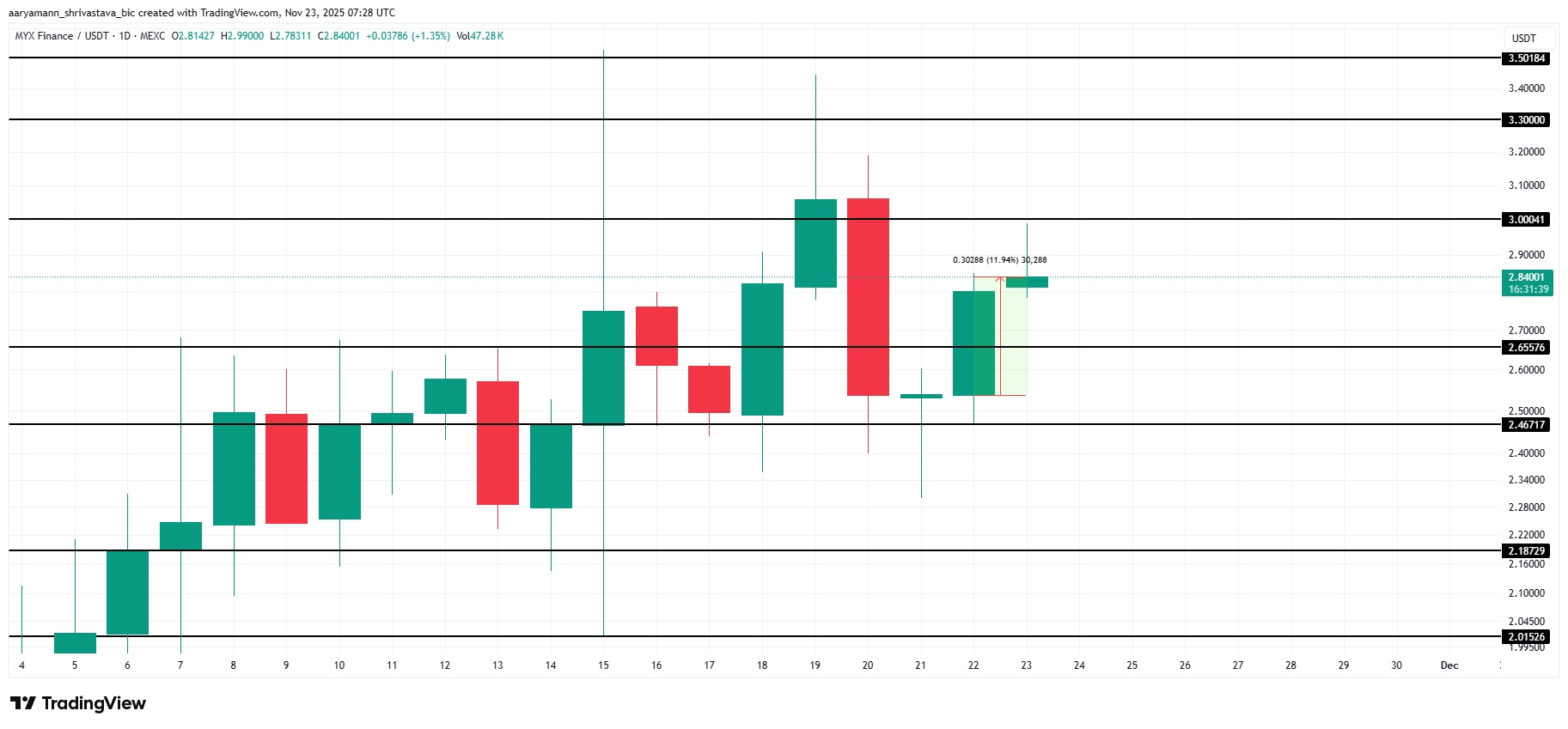 A MYX está posicionada logo abaixo da importante barreira de US$ 3,00 e pode tentar um novo rompimento em breve. Se o sentimento geral do mercado se tornar otimista, a altcoin poderá ultrapassar essa resistência e estender sua trajetória em direção a US$ 3,30. O apoio sustentado dos compradores será essencial para esse movimento.
