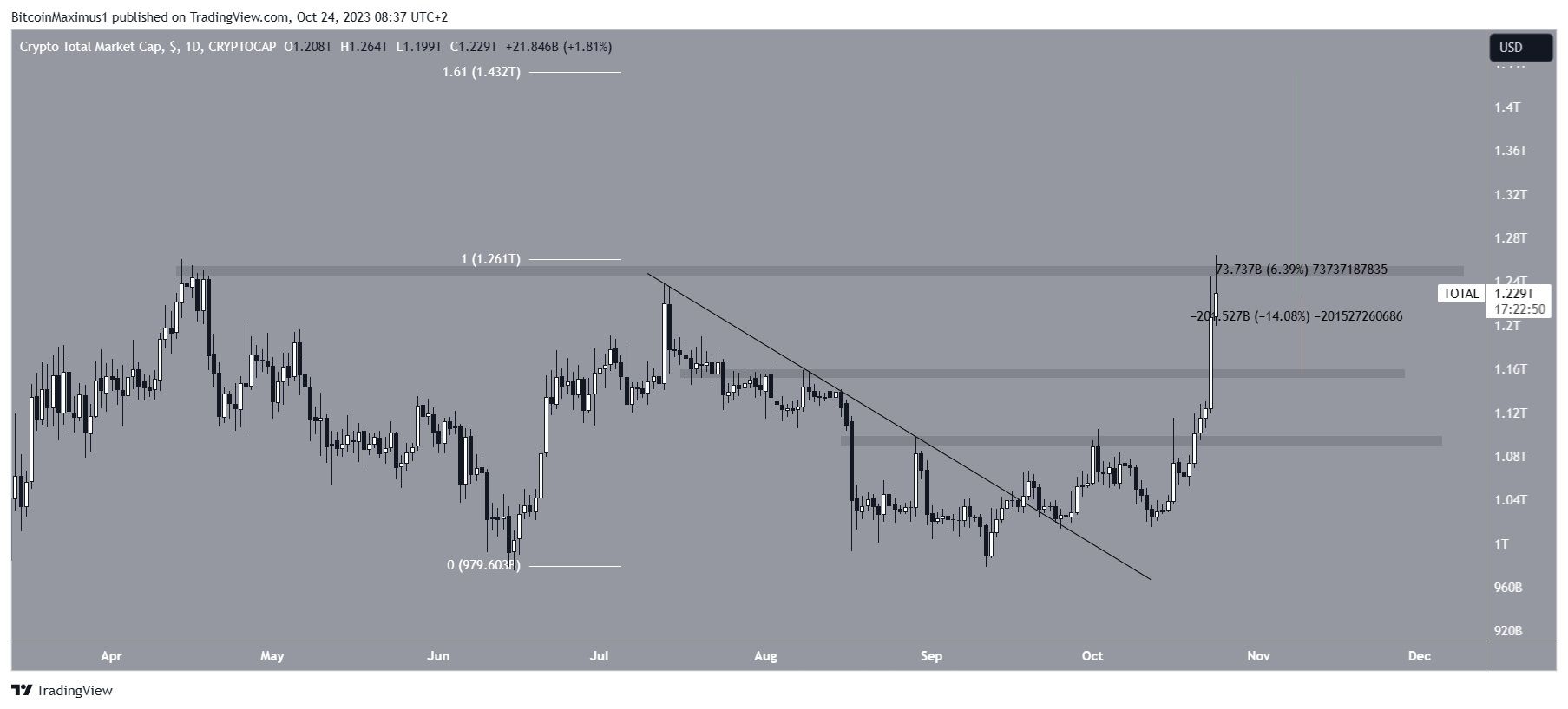 O TOTALCAP está em tendência de alta desde 11 de setembro. Ele rompeu uma linha de tendência de baixa em 18 de setembro e a validou como suporte sete dias depois (ícone verde). Desde então, subiu a um ritmo acelerado.