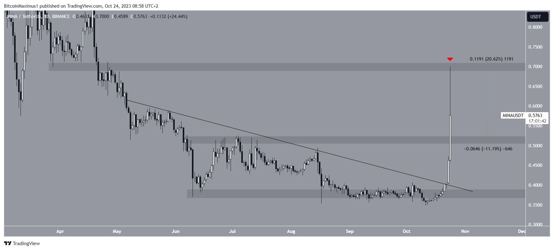 O MINA aumentou rapidamente desde que rompeu uma linha de tendência de baixa em 21 de outubro. O movimento tornou-se parabólico no dia seguinte, levando a uma alta de US$ 0,70.