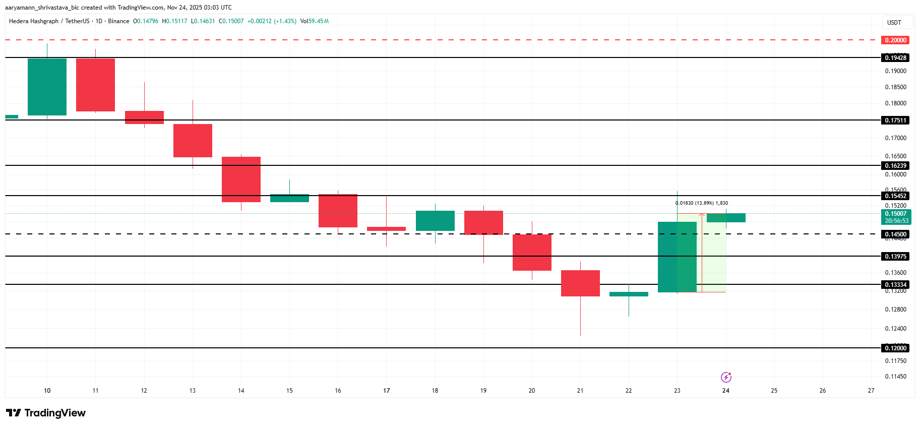 Se os investidores começarem a realizar lucros, a HBAR poderá perder força e cair abaixo de US$ 0,145. Uma queda mais acentuada poderia levar o preço a US$ 0,133 ou menos. Isso invalidaria a tese de alta e sinalizaria uma nova fraqueza, com o aumento da pressão vendedora.