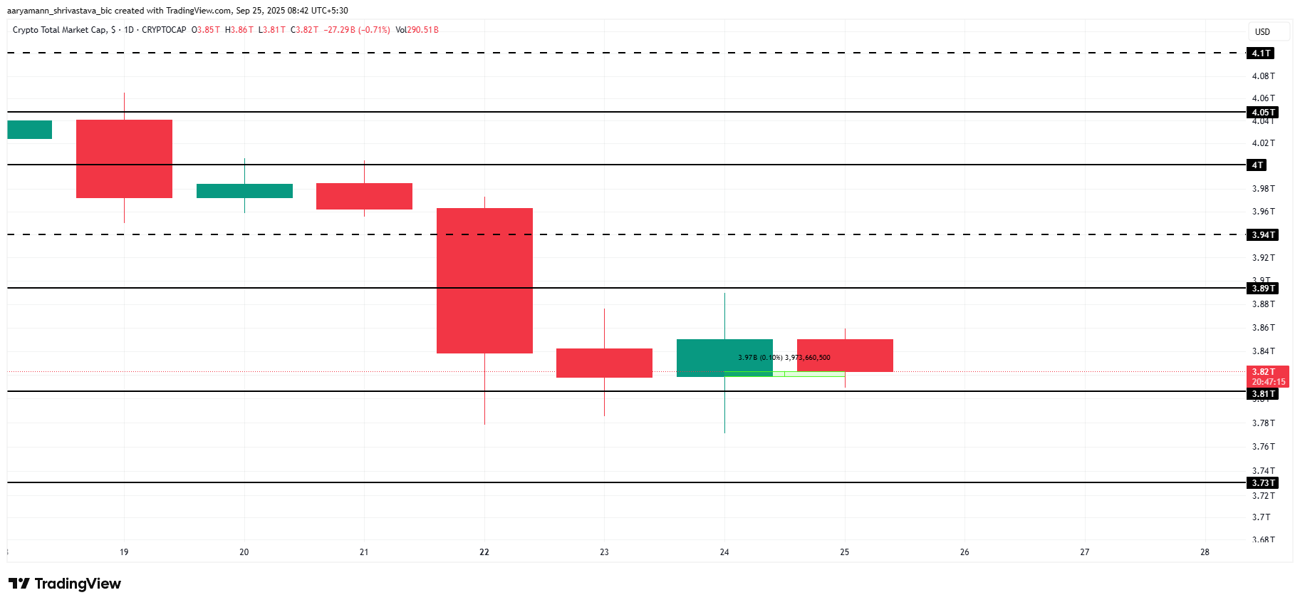 No entanto, se o momentum de baixa se intensificar, o TOTAL corre o risco de cair abaixo do suporte de US$ 3,81 trilhões. Uma quebra desse nível pode desencadear uma queda ainda maior, com o mercado potencialmente caindo para US$ 3,73 trilhões.