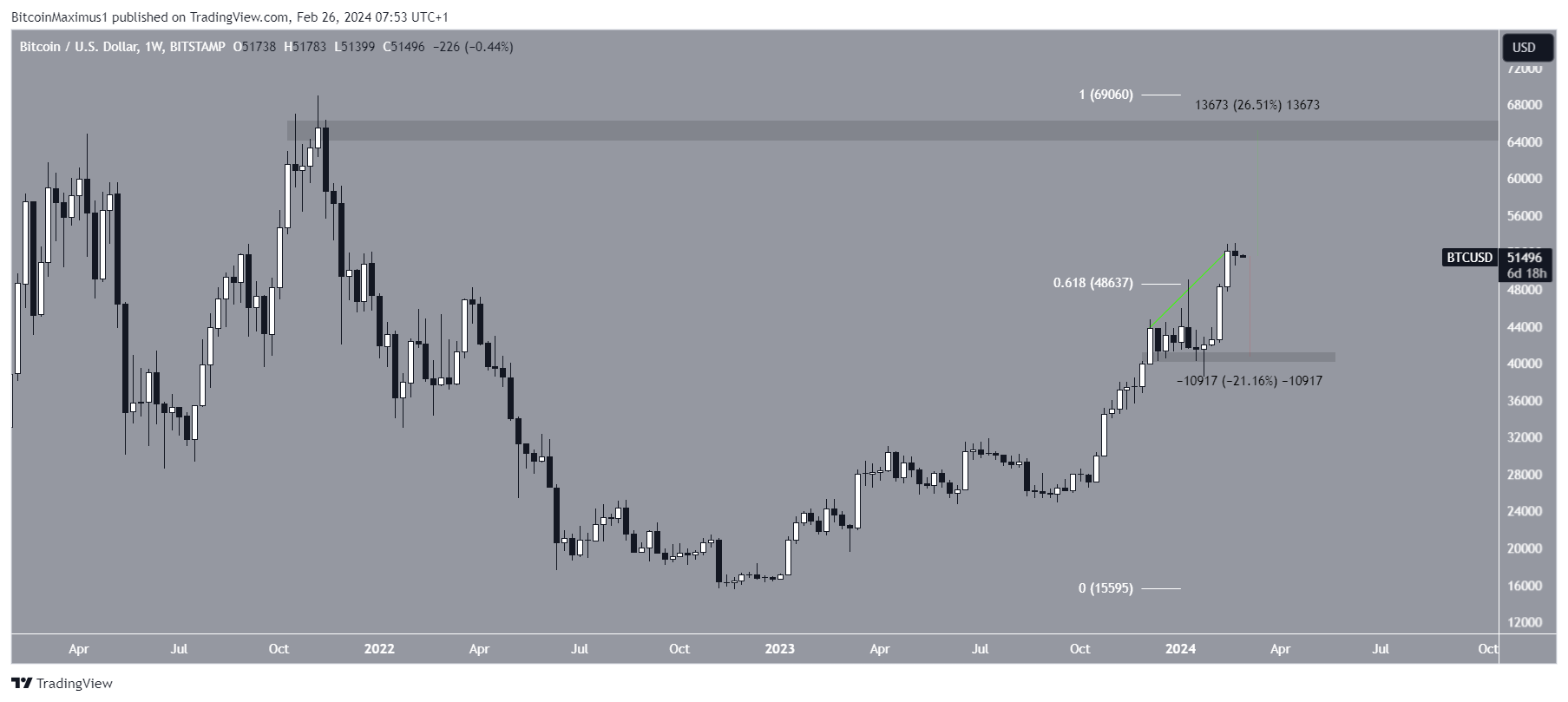 Da mesma forma que o TOTALCAP, o Bitcoin está em alta desde o início de janeiro. O movimento levou a uma máxima de US$ 53.000 em fevereiro, a maior desde 2021. Isso também levou a um fechamento acima do nível de retração de 0,618 de Fibonacci em US$ 48.640.