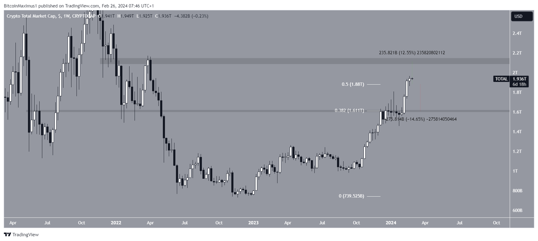 Depois de ultrapassar o nível de retração de 0,382 de Fibonacci em US$ 1,61 trilhão, o TOTALCAP aumentou e fechou acima do nível de retração de 0,5 em US$ 1,88 trilhão.